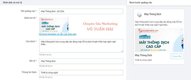 Sau khi hoàn tất việc tạo nội dung quảng cáo video Zalo có thể xem trước mẫu quảng cáo ở cột bên phải nhé